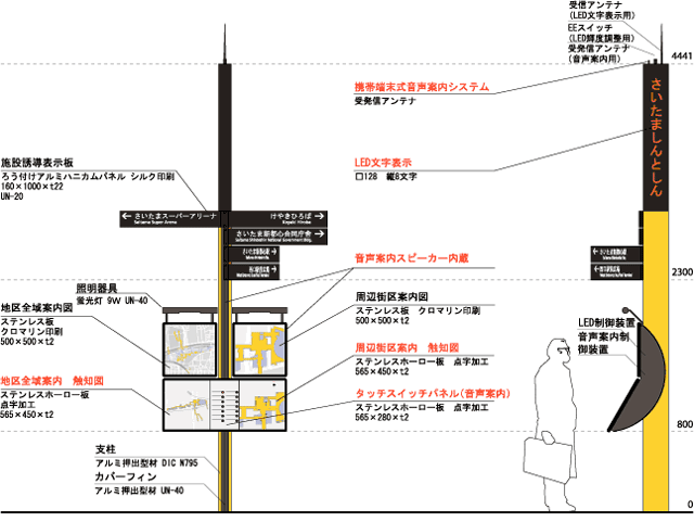 晴盲両用地図システム、ボタン式経路音声案内(経路情報)、携帯端末式音声案内システム(現在地情報)、サイン音によるエリアのアイデンティティ認識、LED電光文字表示など、さいたま新都心のサイン計画は、従来のサインを超える機能を多様に備えたものとなっています。