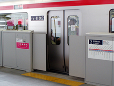 ホームに上がると目に付くのがホームドアだ。つくばエクスプレスは、全駅にホームドアシステムを装備している。車両のドアと駅の可動式ホーム柵とが連動して開閉する仕組みだ。コストやホームが狭くなるという欠点があるが、転落事故防止など安全上これにまさる配慮は無い。よく見ると、各ゲートに車両とドア番号が点字表記されている。視覚に障害のある利用者が自分の乗車位置を把握するための配慮だ。さらに事故防止のためにインターホンを設置するなど、安全にも配慮している。