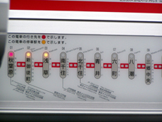 ドアの上にある車内案内表示器もなかなか良くできている。これから停車する駅を黄色、終点を赤色のランプで示しているので、今どこの地点を走っているのか一目でわかる。同時に、音声案内で駅名と駅番号を知らせてくれるので、乗り越す心配は少ない。