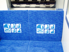 【写真左:車椅子スペース、1編成に2箇所確保されている。写真右:優先席のマーク、窓だけでなくシートにもプリントされている。】